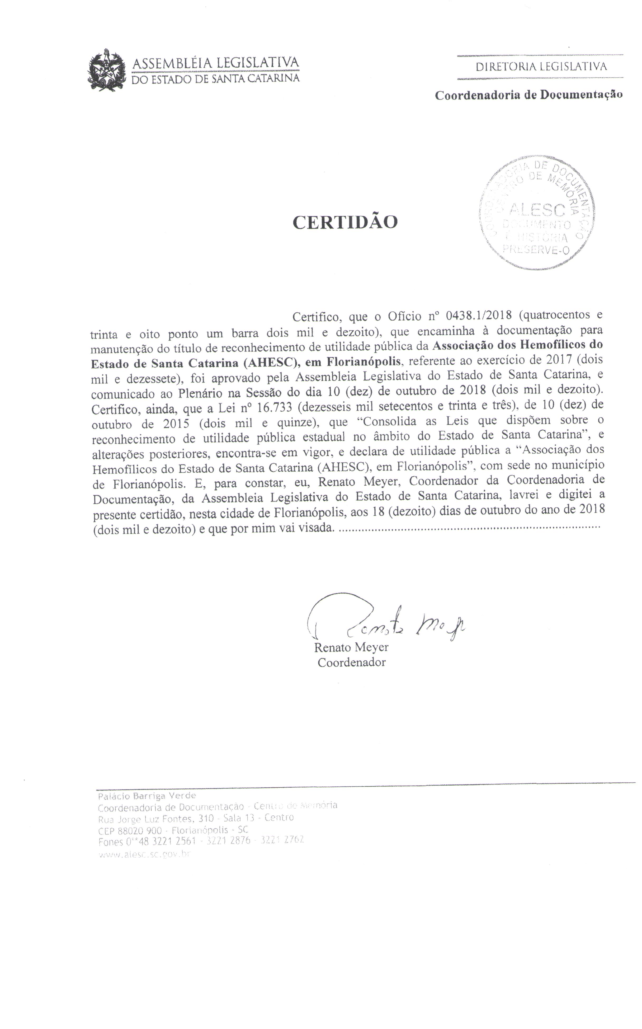 Certidão utilidade pública municipal AHESC 2019.
